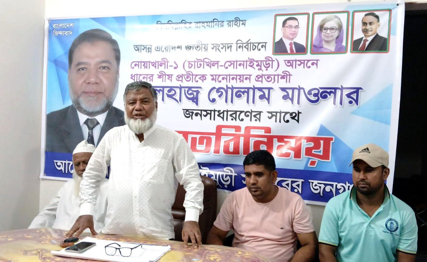 আসন্ন ত্রয়োদশ জাতীয় সংসদ নির্বাচনে নোয়াখালী-০১ (চাটখিল-সোনাইমুড়ি) আসনে ধানের শীষ প্রতীকে মনোনয়ন প্রত্যাশী আলহাজ্ব গোলাম মাওলা আজ বুধবার সন্ধ্যায় চাটখিল পৌরসভাস্থ ১১ নং পোল সংলগ্ন তার নিজস্ব অফিসে উপজেলার সর্বসাধারনের সাথে মতবিনিময় করেছেন।